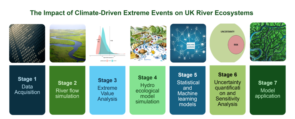 Predicting the impact of extreme events on river hydro ecology and water quality under uncertain climate conditions is a complex but critical area of research [1]. This approach necessitates the integration of extensive datasets (e.g. climate projections, river flow, ecological data), advanced models (e.g. hydrological, ecological, computational), and sophisticated data science techniques, such as probabilistic methods for uncertainty quantification and mathematical extreme value theory [2, 3]. By combining these elements, the project aims to assess and predict how extreme events—like floods, droughts, and temperature spikes—will affect river ecosystems [4].