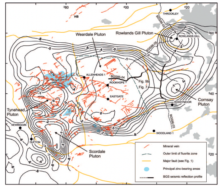 Figure 1. Contours show the outline of the North Pennines Batholith and loca-tion of Rookhope and Eastgate boreholes. Major faults (yellow) and mineral veins (red) also shown. (Figure from Kimbell et al 2010).