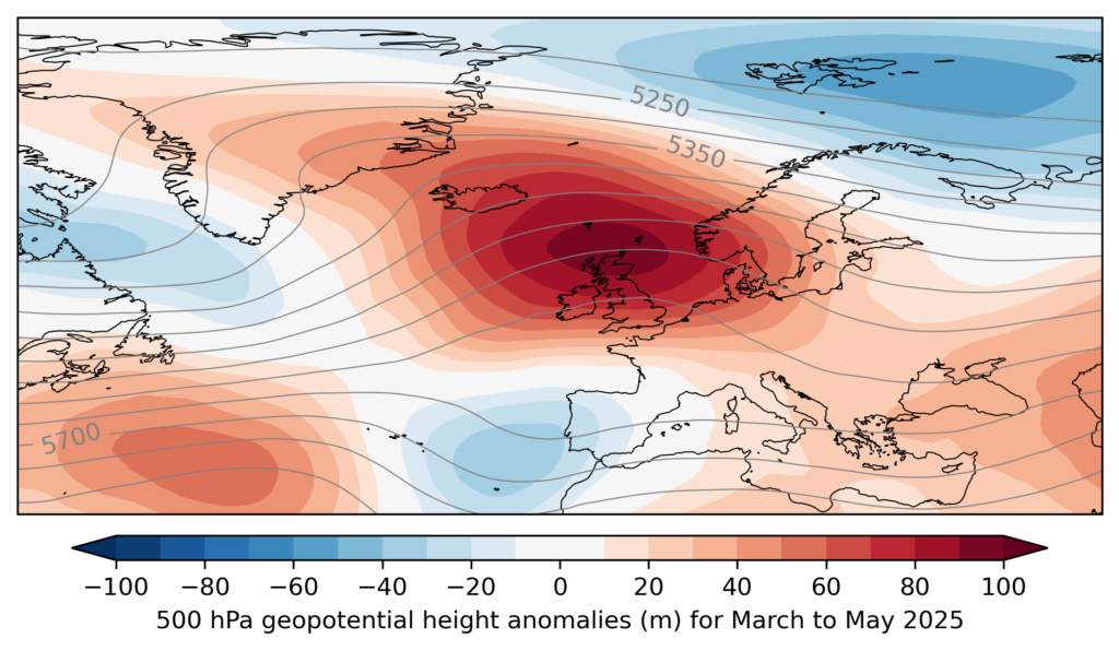 Mid-tropospheric circulation anomalies averaged over March to May 2025, which was the UK’s warmest, sunniest and sixth driest spring on record. (Data source: ECMWF ERA5 reanalysis.)