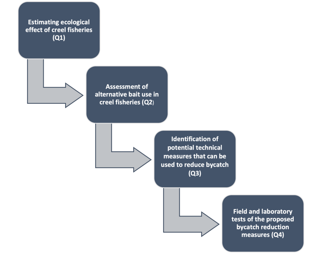 First, the project will aim to estimate creel fisheries effect on non-target species (Q1).The candidate will assess catch composition in existing creel fisheries, with a particular focus on bycatch, including juvenile brown crab and lobster and other non-target species. This will involve systematically assessing available information (conducting systematic literature review) and filling research gaps through new data collection at sea. New data will be collected by monitoring of catches and, where relevant, the application of video recording analysis. The second part of the project will estimate fishing performance and cost effectiveness of using alternative bait sources in a creel fisheries targeting lobster and brown crab (Q2).