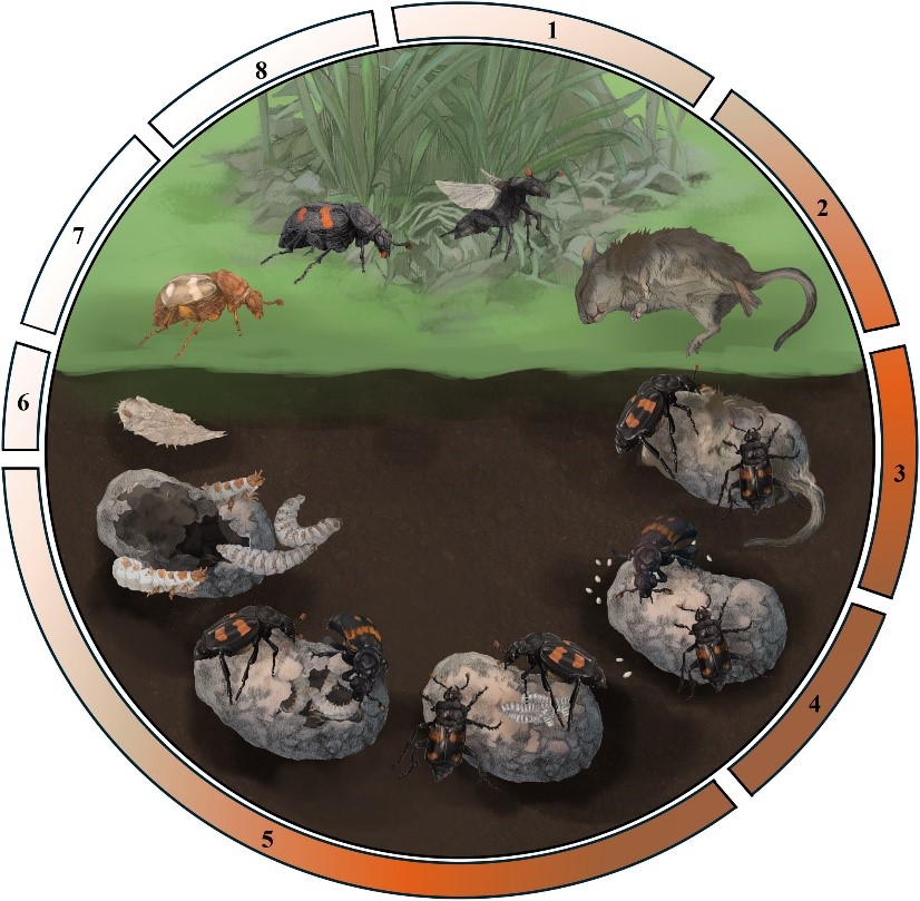 Life history of Nicrophorous: (1) dispersal, (2) locating a small animal carcass, (3) carcass preparation and mating, (4) oviposition, (5) offspring rearing which can include parental care, (6) pupation, (7) eclosion, and (8) sexual maturity. Image credit: Kathryn Kollars, with caption adapted from Potticary et al. (2024) Ecology and Evolution 14:e70175 (CC BY 4.0 International)