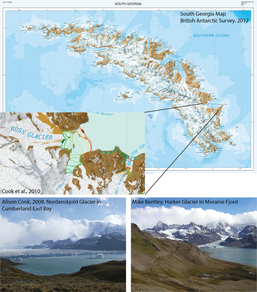 South Georgia map from the British Antarctic Survey, 2017. Inset shows extract of glacier termini mapped on South Georgia from archival aerial imagery (Cook et al. 2010). Photographs show glaciers from South Georgia.